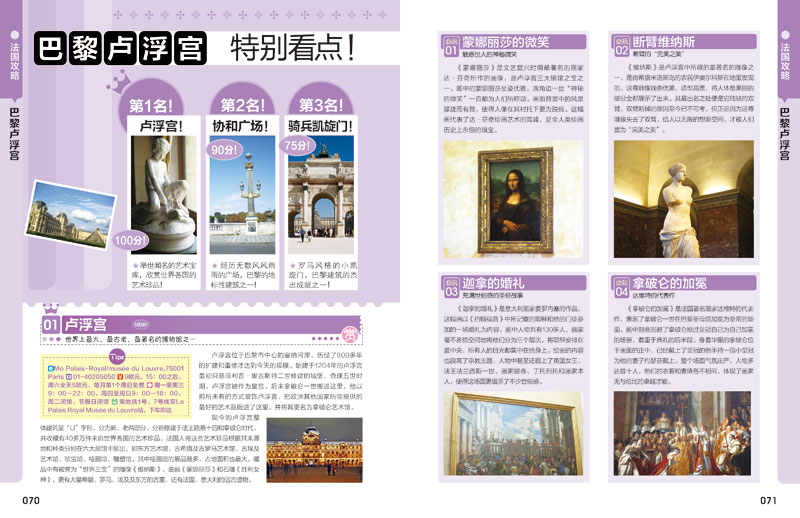 《法国攻略》全面介绍法国概况、最新旅游资讯、热门景点信息、法国艺术文化等,注重最好玩、风景最美、最有艺术感,更有小贴士告知地理位置、开放时间、交通、门票、推荐等级,配有全彩实景照片,方便您为自己的私人旅行订制一套完美计划。