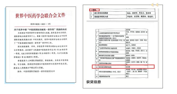 “中医药国际贡献奖”是2005年4月经中华人民共和国科学技术部批准设立的中医药国际奖项,用于表彰在中医药领域做出突出贡献的组织与个人,由世界中医药学会联合会负责评审与授奖工作,在国际上产生深远影响。2023年在“中医药国际贡献奖”基础上首次增设“中医药国际贡献奖-著作奖”,旨在提高中医药学术水平、系统研究中医文献、规范中医药工具书、融会国内外中医药学术的最新成就、总结海内外中医药实践技术与经验、促进中医医疗、教学和科研并促进中医药国际传播,鼓励中外文版中医药科普著作的发表等。